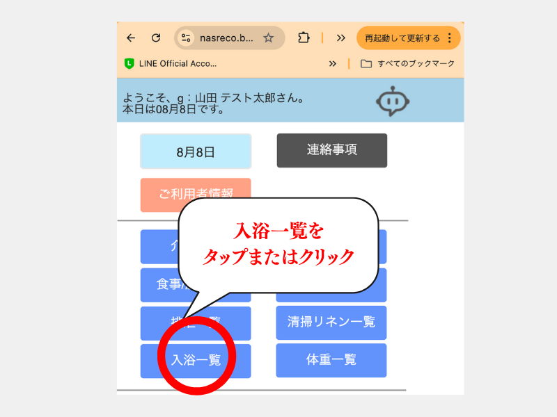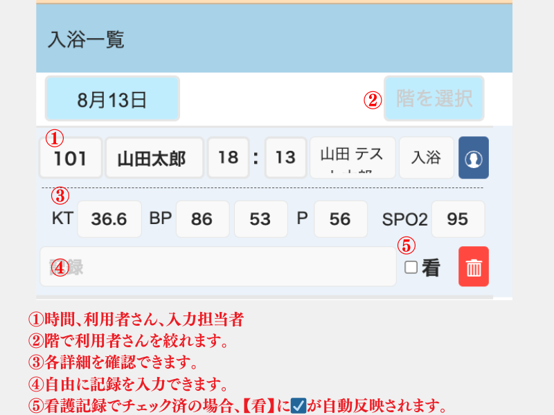 9-1:入浴一覧の見方 2024 8/13 このページを印刷する 9-1-1:入浴一覧の見方 9-1-2:注意事項 戻るボタンは右にある【三】を利用してください。その他の戻るボタンを使うと【自動ログアウト】され、再ログインが必要になります。 未分類 基本操作