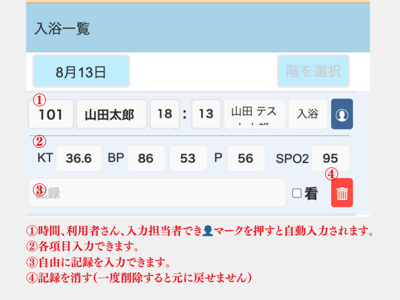9-2:入浴一覧の入力方法 2024 8/16 このページを印刷する 9-2-1:入浴一覧の入力方法 9-2-2:注意事項 戻るボタンは右にある【三】を利用してください。その他の戻るボタンを使うと【自動ログアウト】され、再ログインが必要になります。 未分類 基本操作
