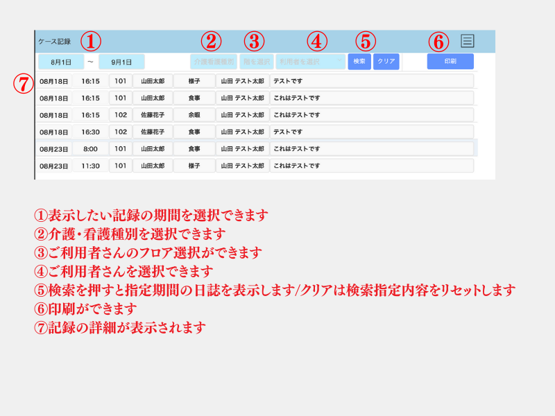 ケース記録では、対応記録に残っている全ての情報を検索・一覧表示・印刷をすることができます。