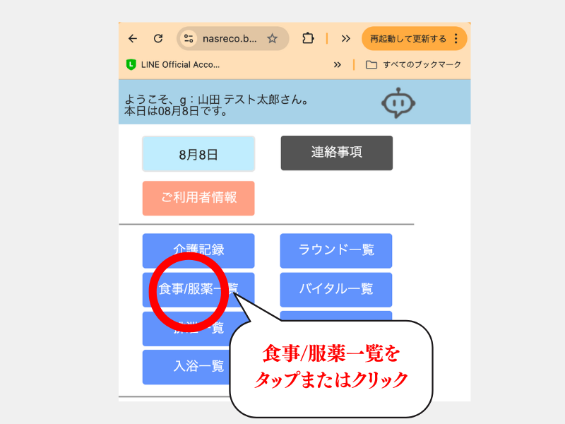 食事と服薬と入力ができます。画面の切り替え方、見方はこちらよりご確認ください。