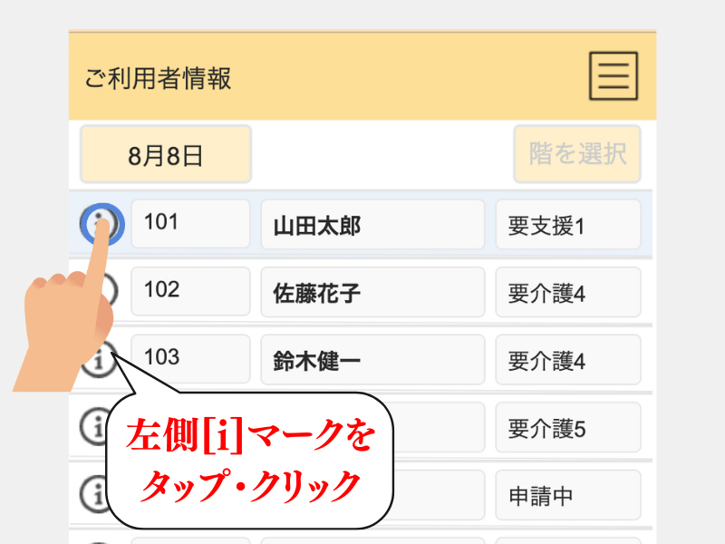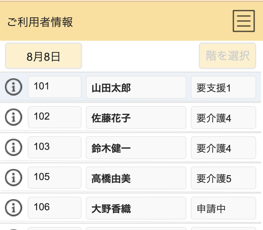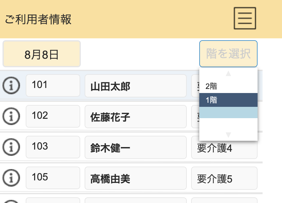 施設のフロアごとに利用者を絞ることもできます。絞り込みをする場合は右上の【階を選択】よりお選びください。