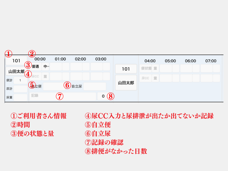7-1:排泄一覧の見方 2024 8/13 このページを印刷する 7-1-1:見方 便計・尿計・尿量は、その日の合計が自動計算で表示されます 7-1-2:注意事項 戻るボタンは右にある【三】を利用してください。その他の戻るボタンを使うと【自動ログアウト】され、再ログインが必要になります。 未分類 基本操作