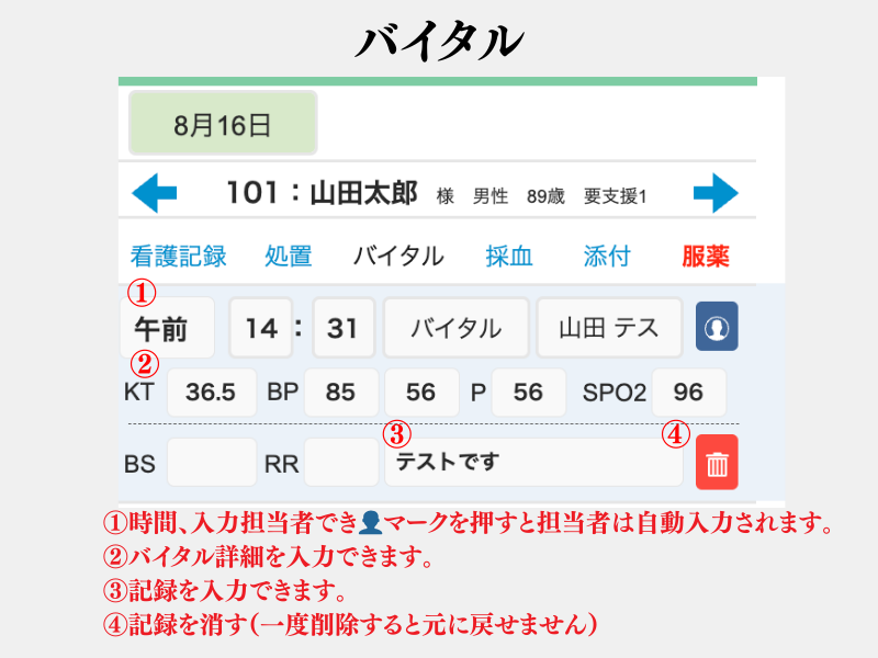 バイタルは、システム内のバイタル一覧などで登録された情報が共有されています。入力変更したものはすべて変更されます