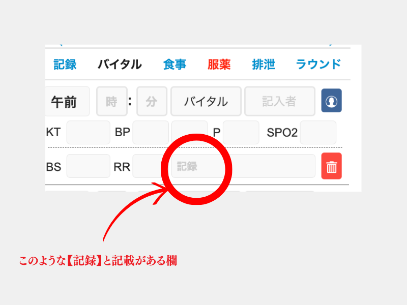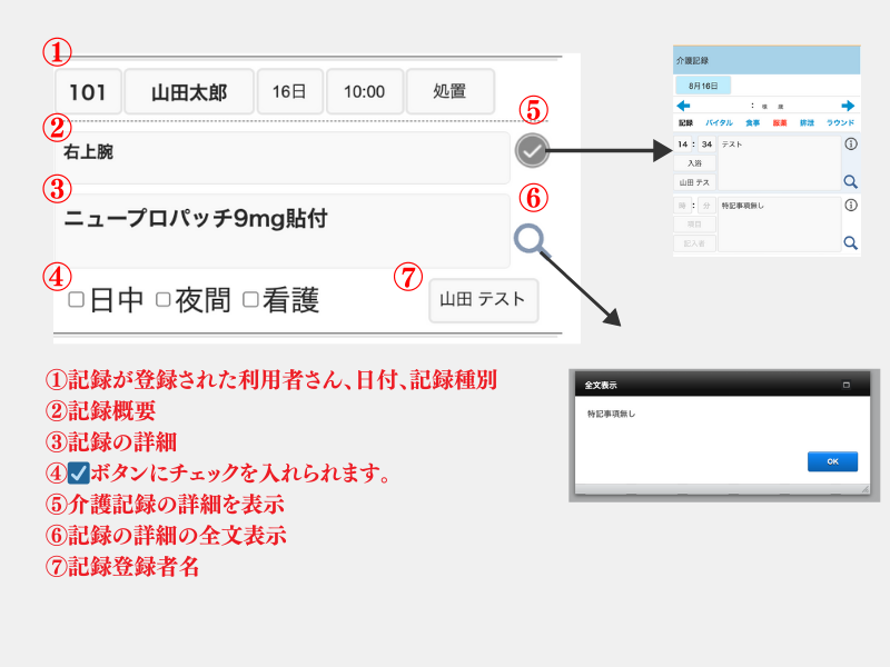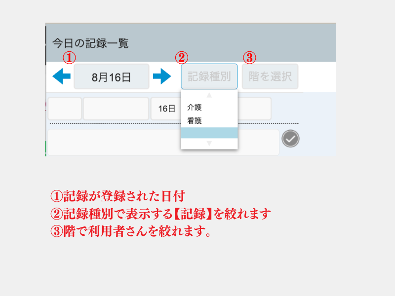 【今日の記録一覧】とは、システム内の【記録】へ何かしら記入事項があった場合表示されます。【記録】欄は以下参照